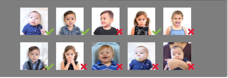 Aceitável - Não há outra pessoa na foto e a criança está de frente para a câmera com os olhos abertos. Dica de foto: É aceitável que os olhos do seu bebê não estejam totalmente abertos.
